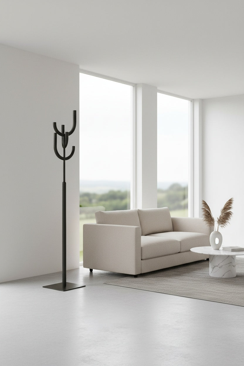 Descripción: Este perchero de acero es el complemento perfecto para cualquier hogar moderno y minimalista. Está diseñado para ser funcional y estético al mismo tiempo, lo que lo hace ideal para cualquier espacio que necesite un lugar para colgar abrigos, sombreros, bolsos y otros accesorios.